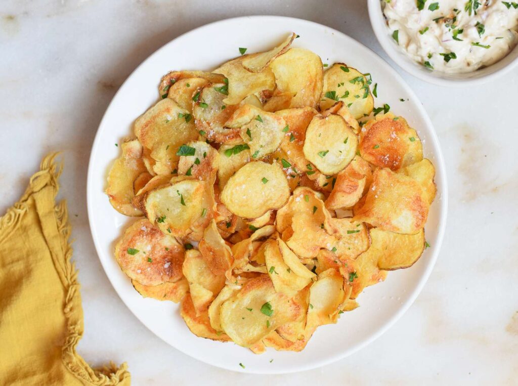 Kartoffelchips in airfryer sind der perfekte Snack: knusprig, lecker und deutlich gesünder als gekaufte Chips. Mit wenig Öl und einfachen Zutaten kannst du in kurzer Zeit selbstgemachte Kartoffelchips genießen.