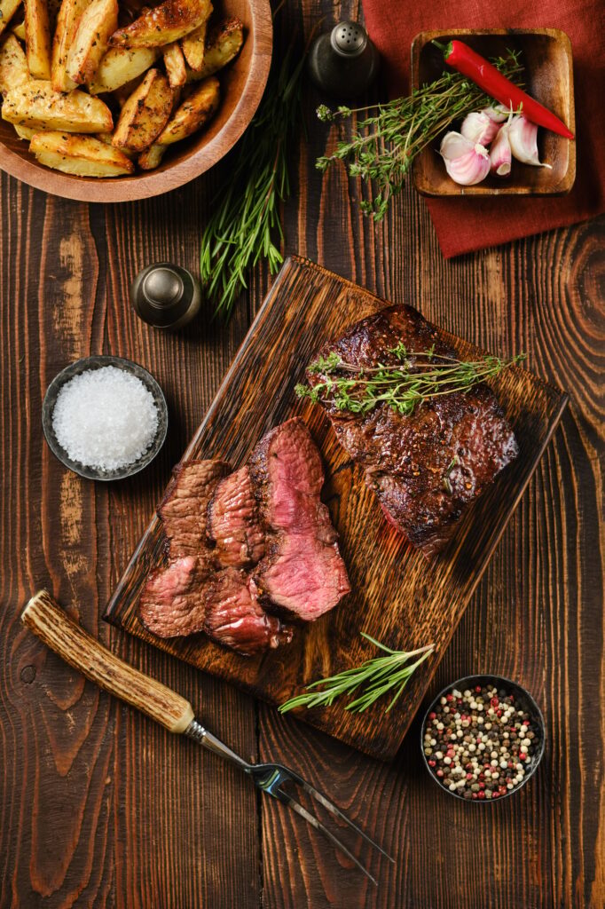 Das Steak nach dem Garen 5 Minuten ruhen lassen, damit sich die Säfte setzen. Mit Beilagen wie Kartoffeln, Gemüse oder einem frischen Salat servieren.